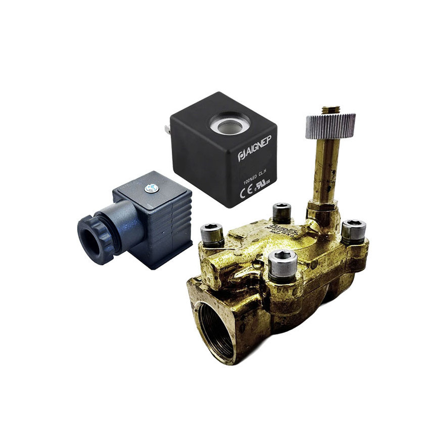 Eletroválvula 2/2 3/4'' de latão, acionamento indireto e normalmente aberta com juntas NBR, 24V DC, Aignep