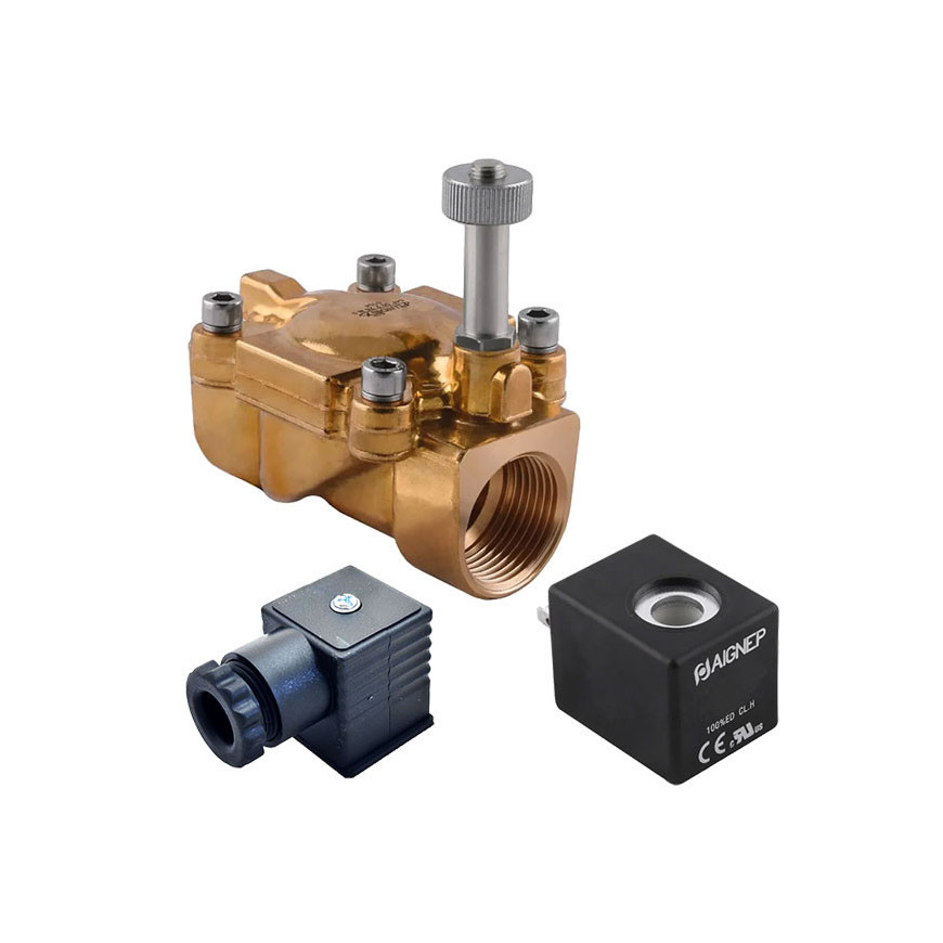 Eletroválvula 2/2 1'' de latão, acionamento indireto e normalmente aberta com juntas NBR, 24V DC, Aignep