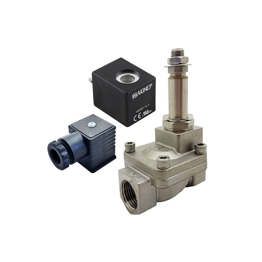 Eletroválvula 2/2 1/2'' de inox, acionamento indireto e normalmente fechada com juntas FKM, 12V DC, Aignep