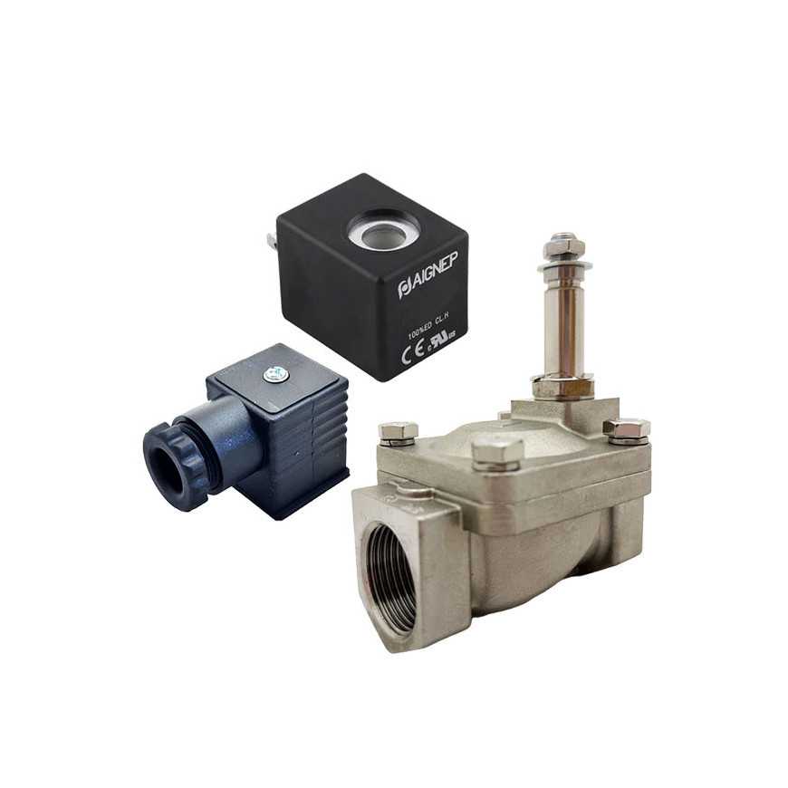 Eletroválvula 2/2 1'' de inox, acionamento indireto e normalmente fechada com juntas FKM, 12V DC, Aignep